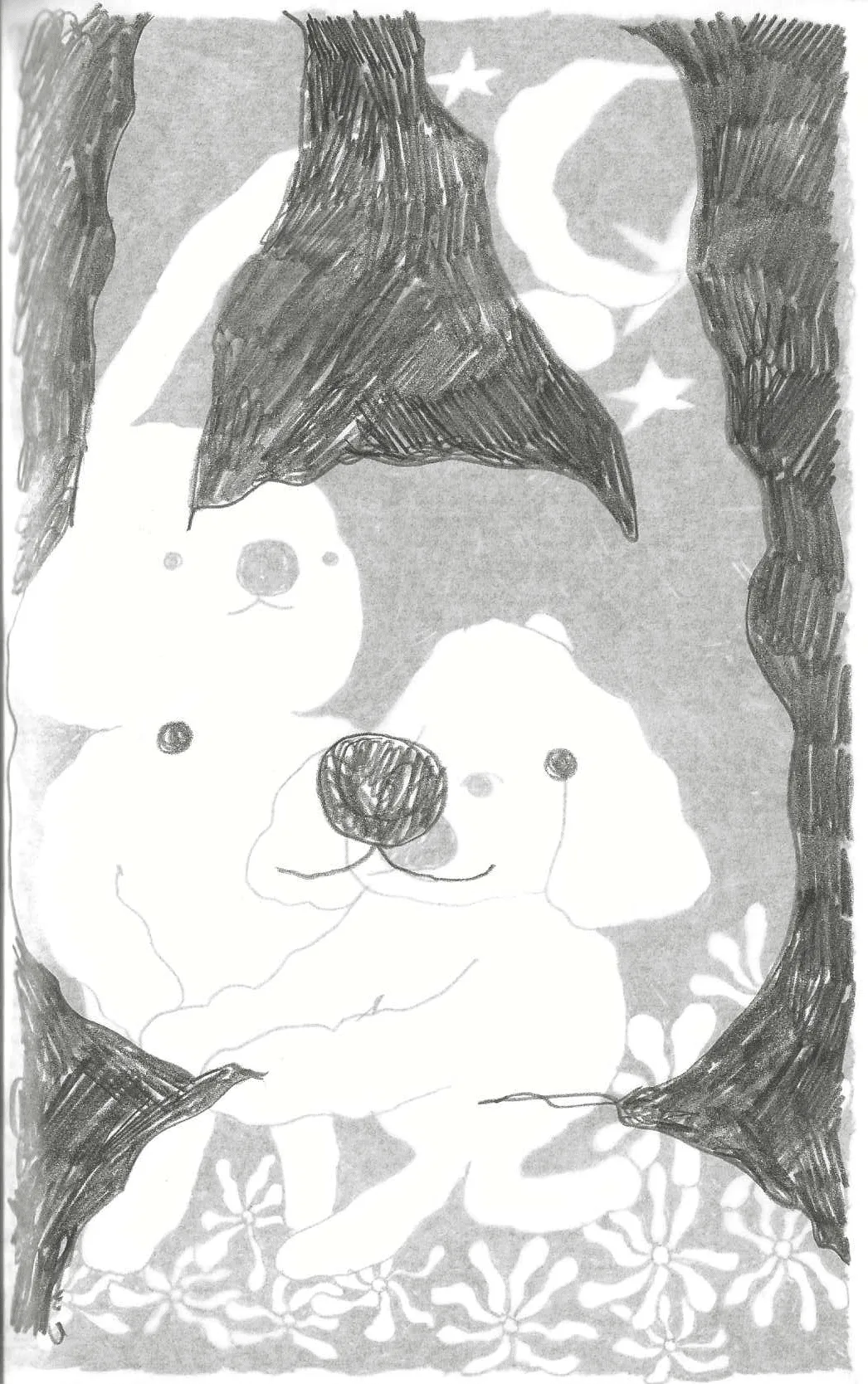 Unlike the others, it is visually cohesive, resulting in a composition that is compelling. The white silhouette of the figure creates a window that looks out onto a nightscape. There, under the stars, the same figure can be seen frolicking through a field of flowers with a friend.