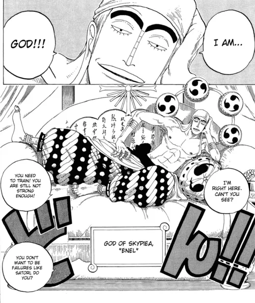 Top: Enel's introduction, One Piece Chapter 254Bottom left: Guanyin of the Southern Sea via Nelson Atkins Museum of Art, Bottom right: Raijin via Sanjūsangen-dō TempleIt's design choices like these that give the impression that Oda is having fun. It's nice to see an artist enjoying themselves. This is further evident in the show's humor. There are so many silly moments that have made me laugh. Then there are the moments that have made me cry. The emotional impact that this show has had on me is a testament to Oda's writing. He balances these high emotional moments really well. When things get a little too intense, he'll throw in a funny gaff to cut the tension.